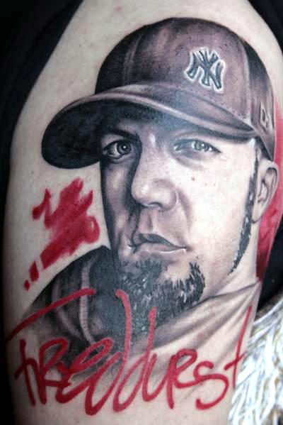 So, technically, this is a really good tattoo. Look at that face! What makes it questionable is that this is Ian Watkins’ mugshot. You know, when he got arrested for like 20 sexual assault charges again a child. And then pleaded guilty to pedophilia. He’s in prison right now. And the “Mega Lolz” is apparently what he told someone from jail when they asked about his attempted rape of a 1 year old boy. So….yeaaaaahhhh. Wow.
