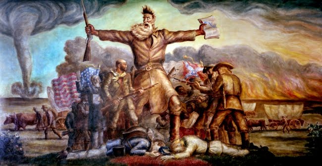 Perhaps what I liked most about the show was the fact that the band is using the famous mural of John Brown as their backdrop (and who’s also on the cover of their first album). It’s such a fantastically American painting — you know, a religious fanatic with a bible in one hand and a gun in the other — who I’m sure did terrible things to loads of people. You can see it yourself in person at the State Capitol in Topeka and it is somehow terrifying, funny and shameful, all at once. Thanks, Mom, for all those super-informative spring break trips driving endlessly across the plains of America where we got to see insane murals like that in person. Childhood memories, yo.